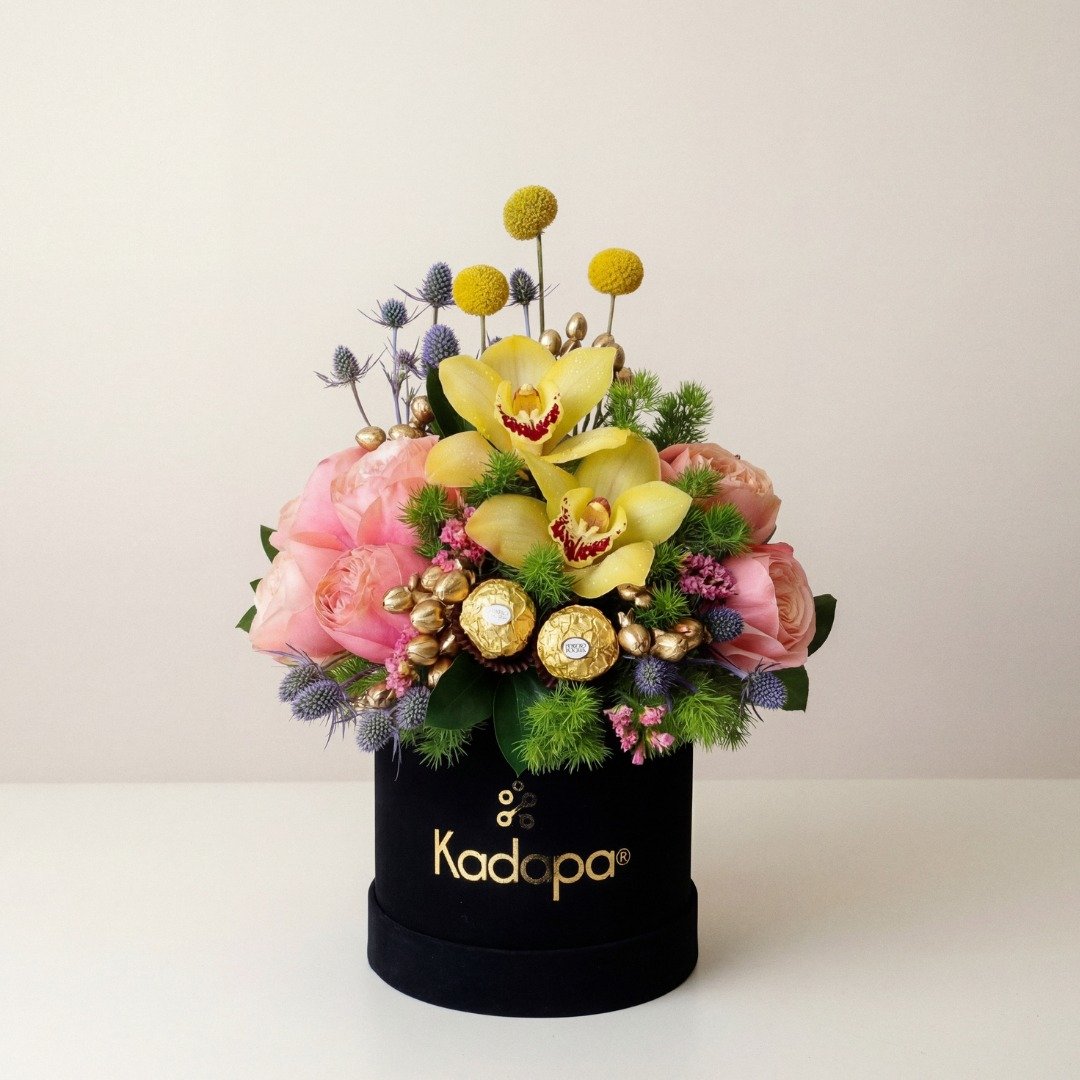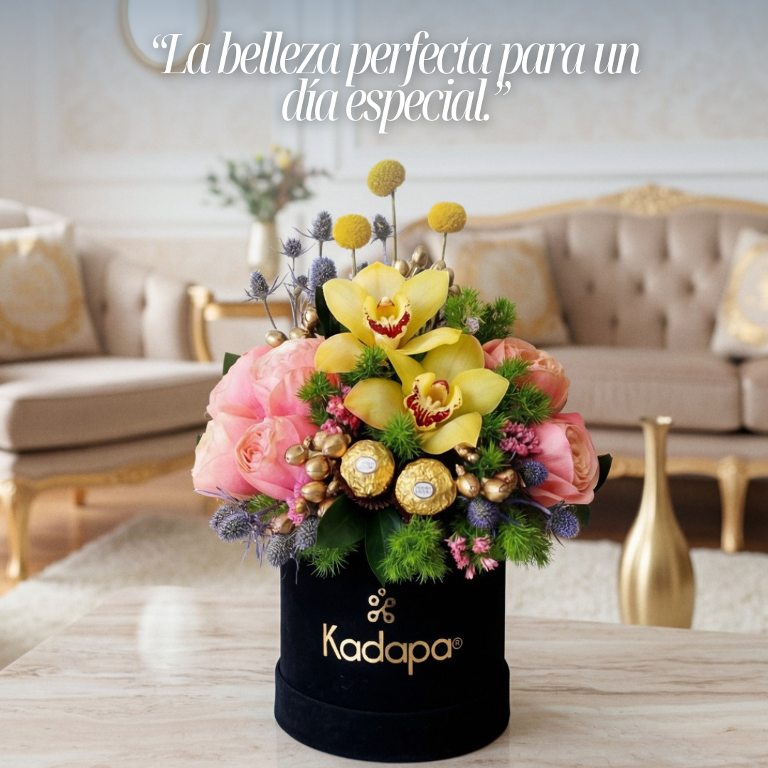 Caja elegante en tono negro, diseñada para resaltar cada detalle. Incluye 8 rosas frescas, 2 orquídeas premium y 2 Ferrero Rocher. Los colores de las flores varían según la temporada, un detalle perfecto para sorprender con estilo y delicadeza.