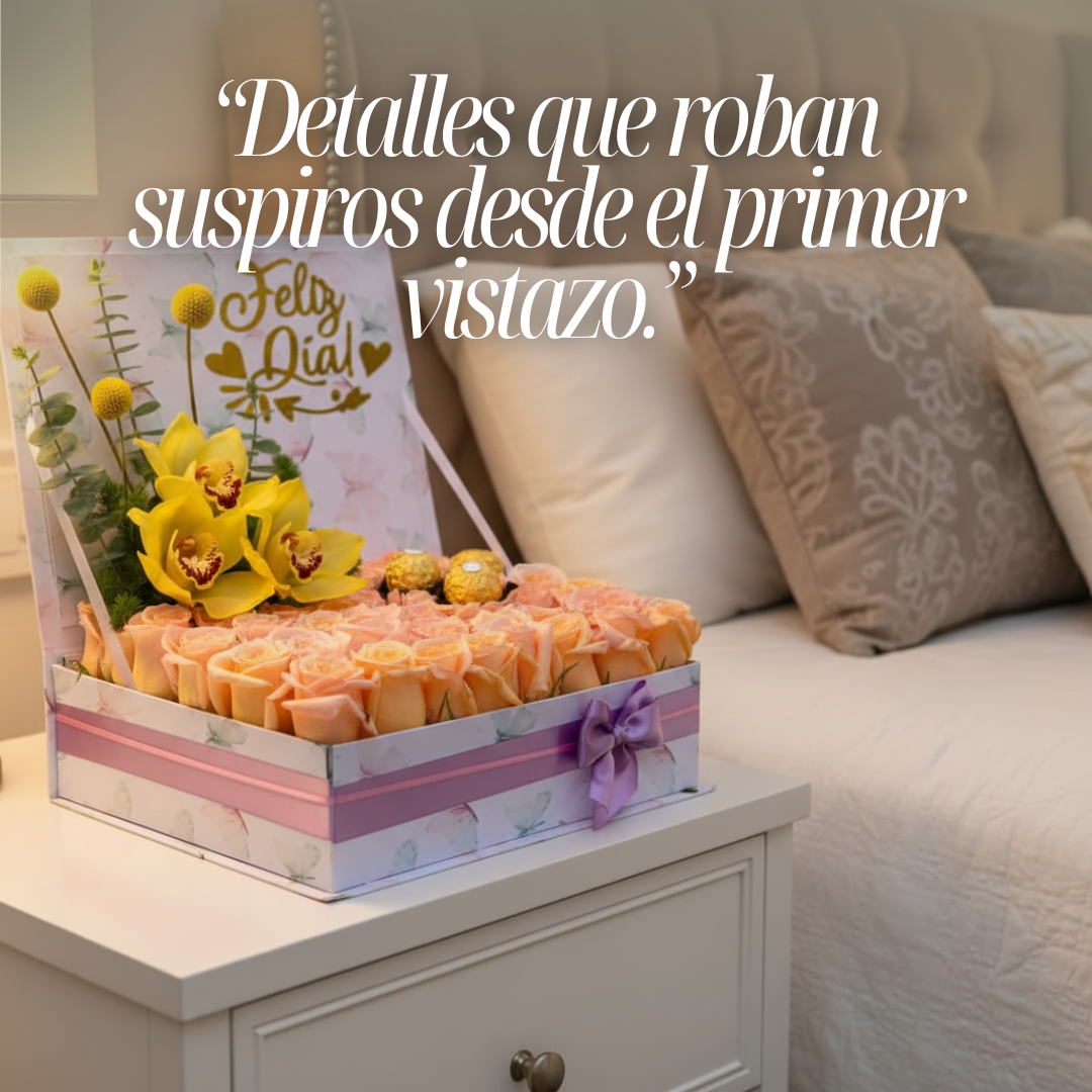 Caja elegante, 24 rosas, 3 orquídeas, 3 ferreros y delicado follaje de exportación.