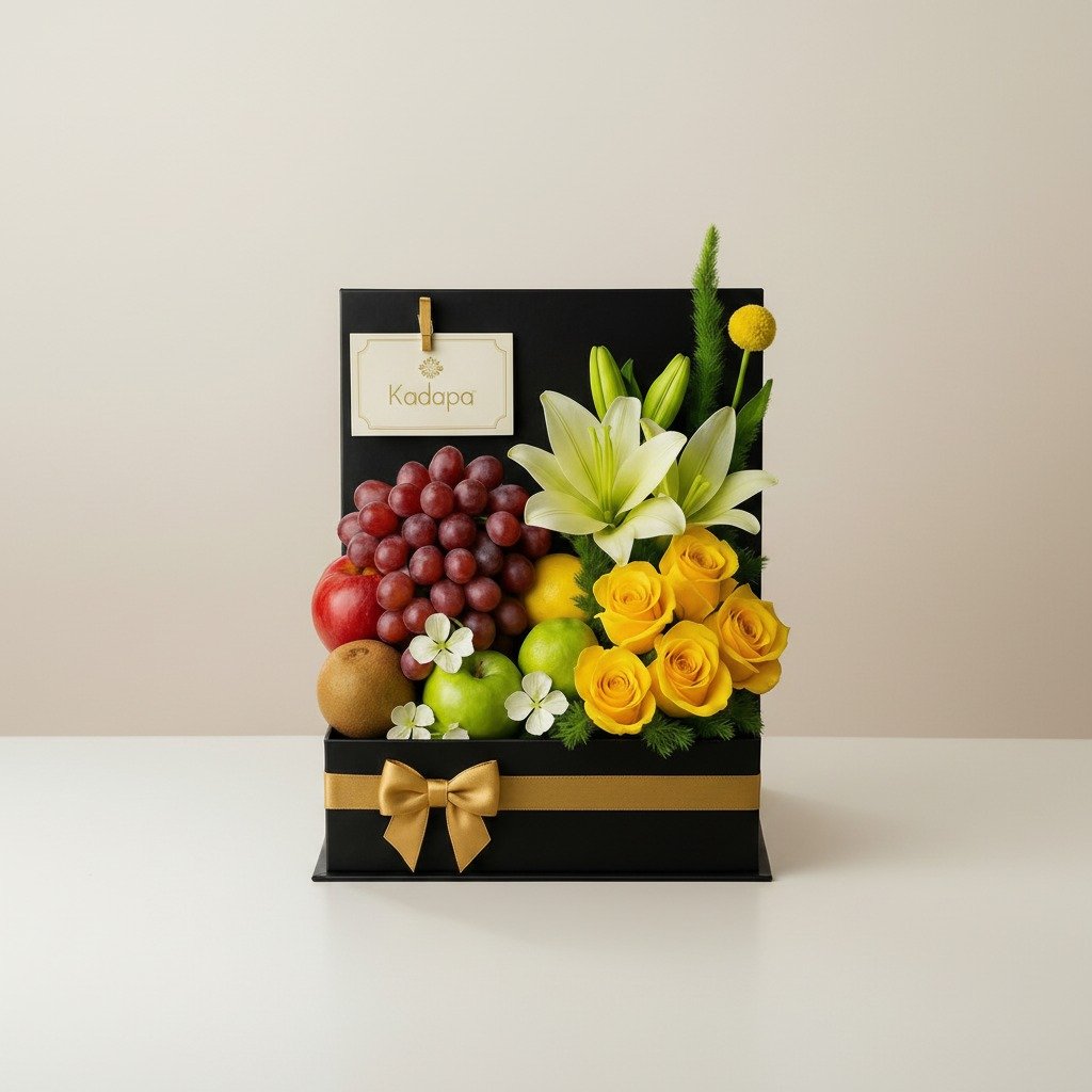 Caja elegante, uvas rojas, durazno, manzanas, kiwis, peras, tarjeta, hermoso detalle floral con rosas y lirios.